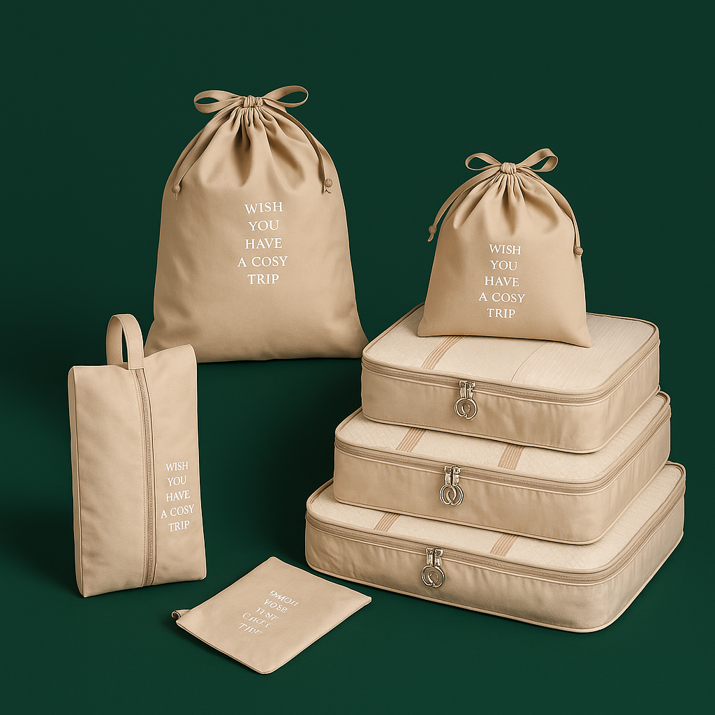 يتكون من ٧ قطع مع شبك شفاف لسهولة الرؤية، ويمكن غسله وإعادة استخدامه، مما يوفر تنظيم مثالي للملابس والأحذية في كل رحلة.