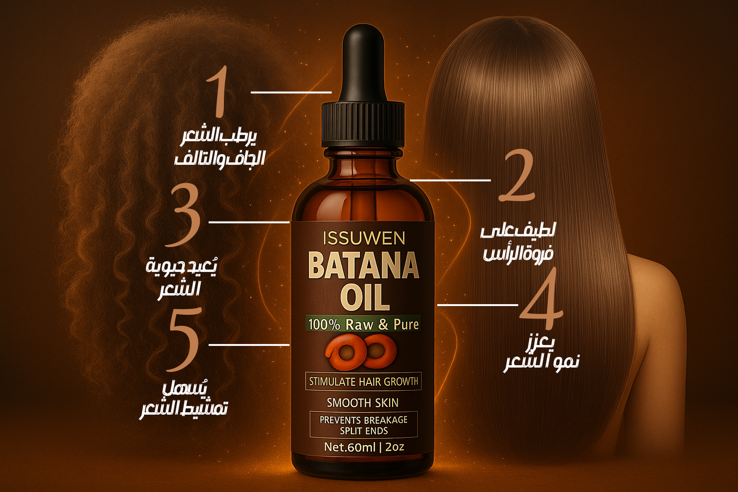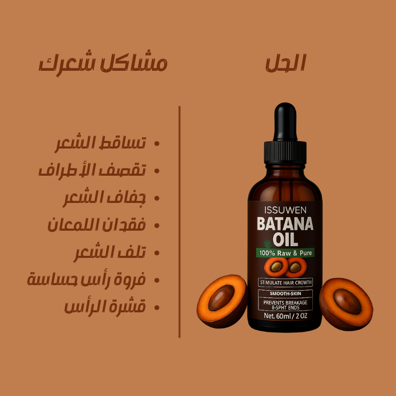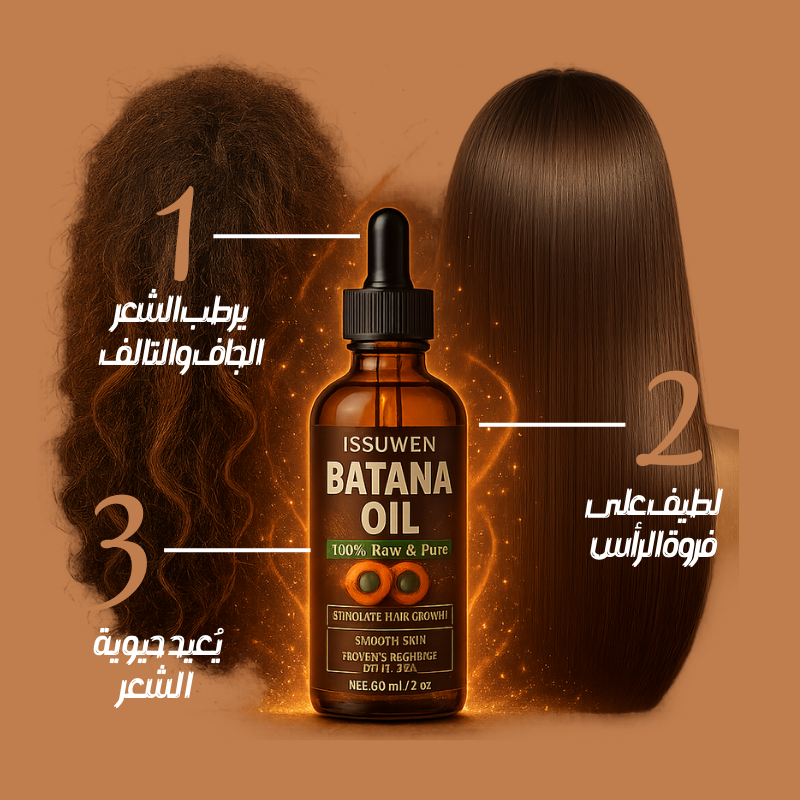 زيت باتانا يعزز نمو الشعر ويغذي فروة الرأس بعمق، يمنحك شعراً أكثر كثافة وصحة، ويقلل من التساقط والتقصف، ليترك لكِ شعرًا ناعمًا، قويًا ومتألقًا.