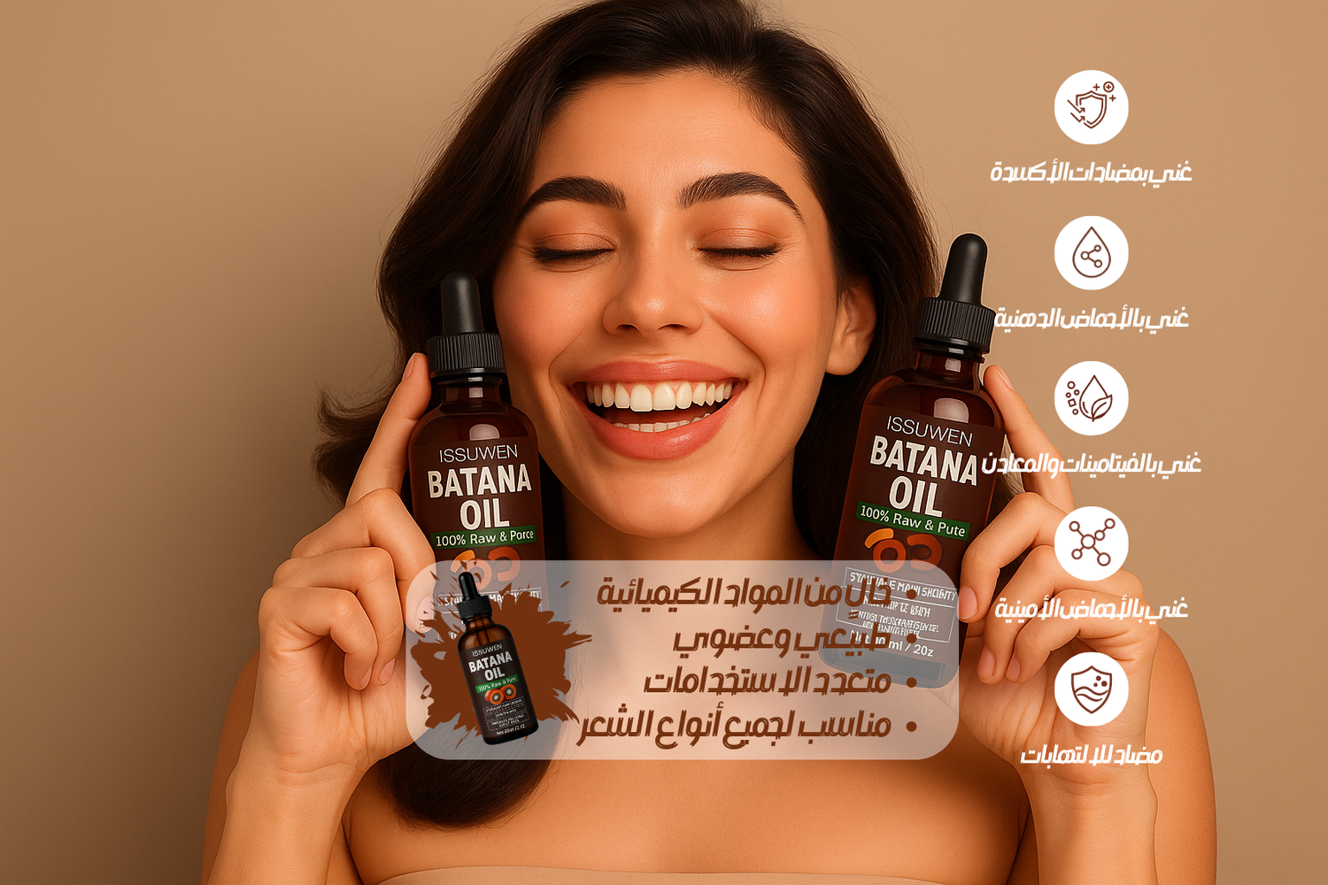 "لا تفوتي فرصة العناية الطبيعية لشعرك! جربي زيت باتانا الآن وابدئي رحلة العناية بشعر صحي وقوي. احصلي على شعر أفضل خلال أسابيع!
