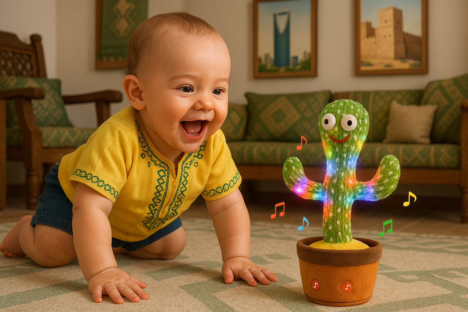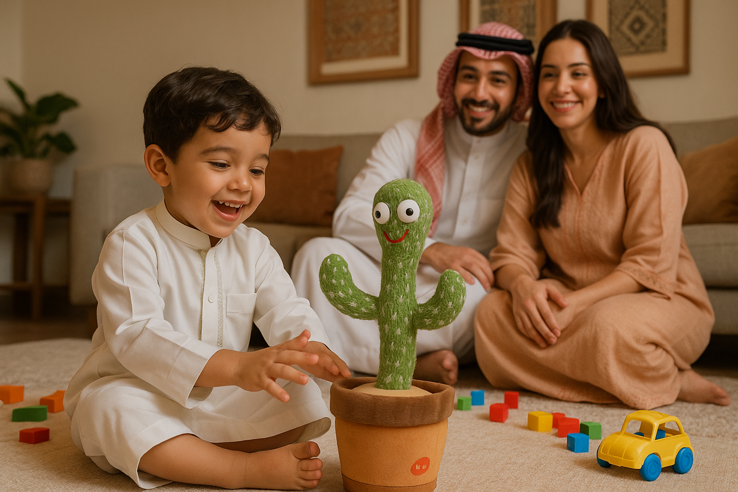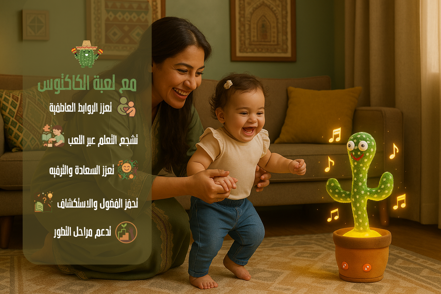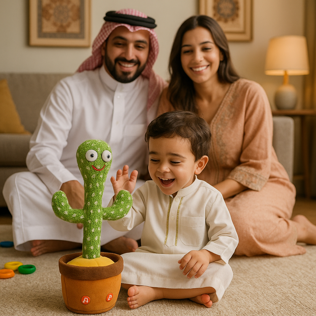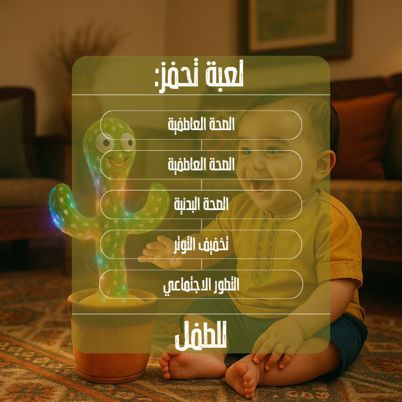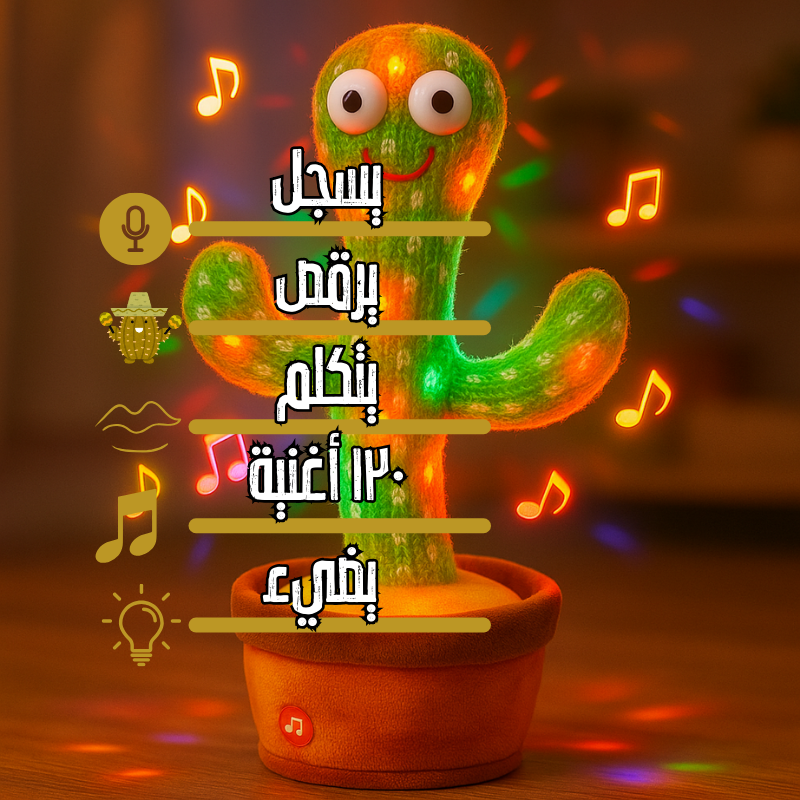 الكاكتوس الراقص مو بس لعبة، هو لحظات سعادة وفرح! يضيف لبيتك جو من الحب والضحك، ويساعد طفلك يتعلم ويستمتع، بينما أنت تكتشف معاه عالم من المرح والموسيقى المبهجة.