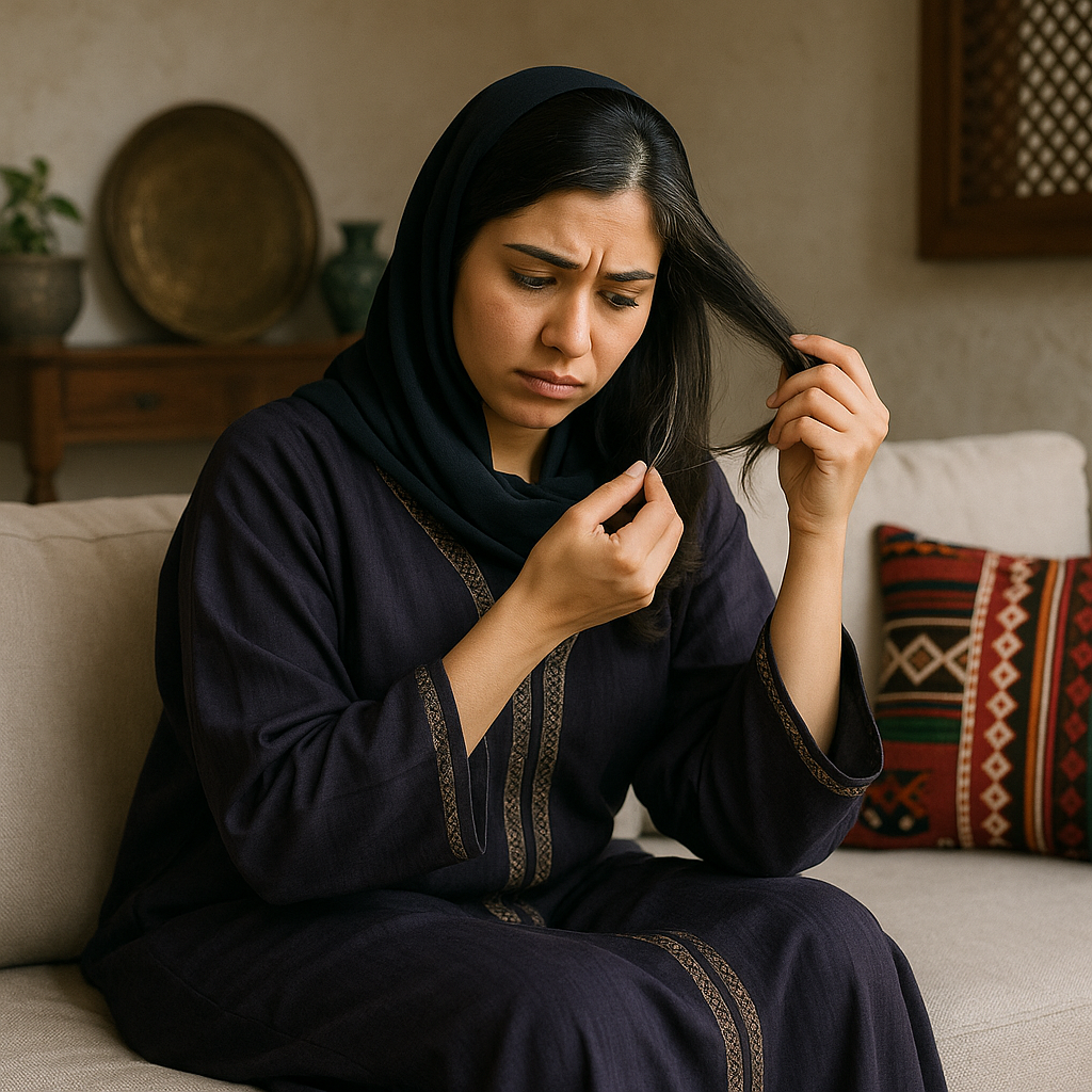 شعرك الأبيض صار همك، وكلهم قدامك شعرهم لامع وجميل، وأنتِ مش قادرة تكشفين عن شعرك خوفًا من نظراتهم اللي تزيد قلقك.