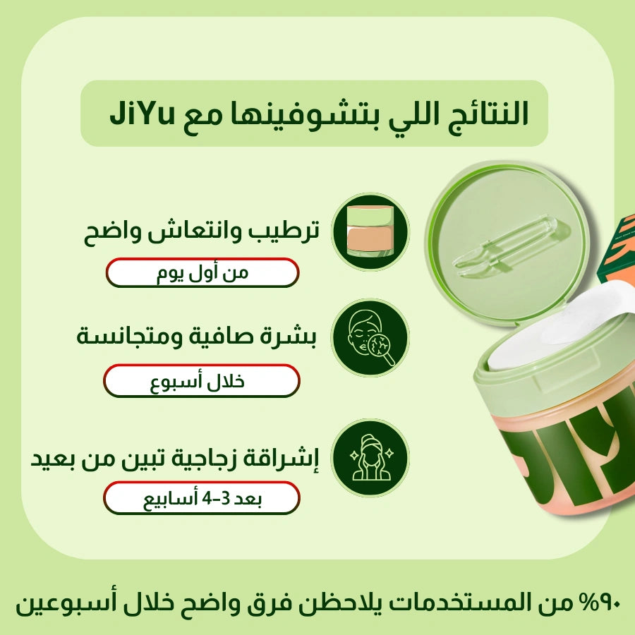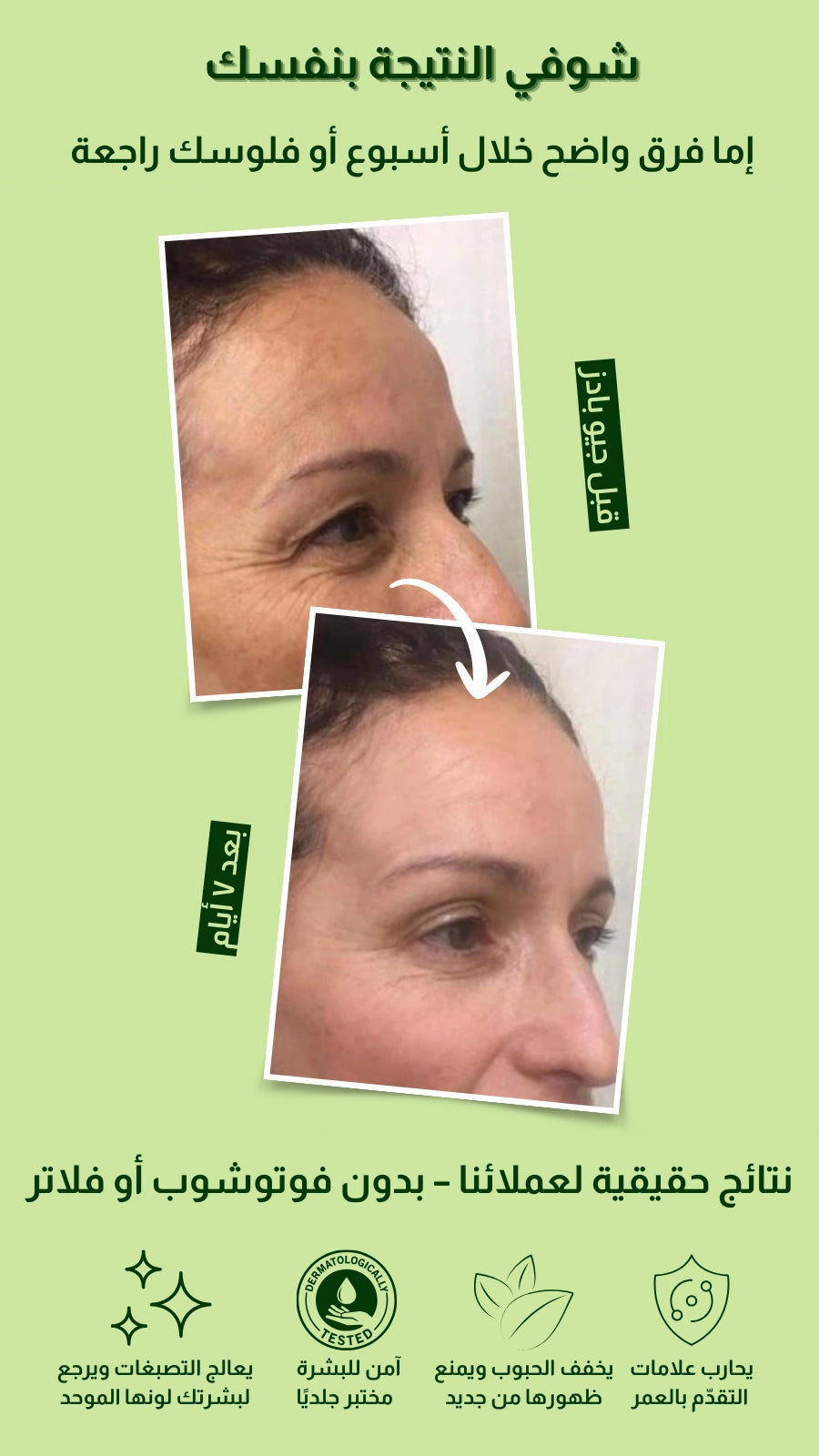 أغلب المستخدمين يلاحظون إشراقة أو ترطيب من الأسبوع الأول، ومع الاستمرار 3–4 أسابيع يبان الفرق الواضح في البقع والخطوط الدقيقة.