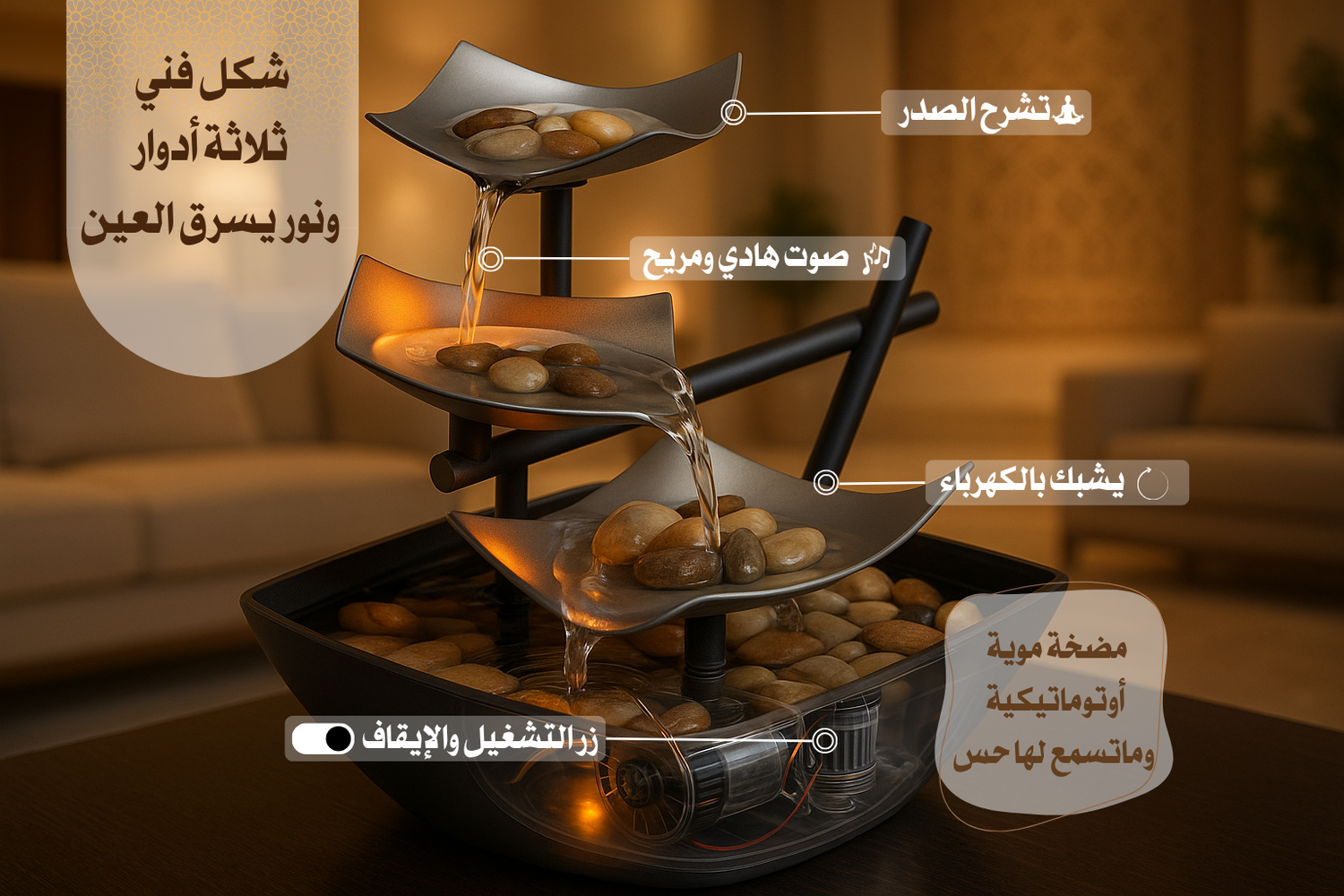 جودة تصنع الهدوء! نافورتك كل ميزة فيها تروّق بالك وتضيف جوًّا من الفخامة. استثمار في راحة روحك.